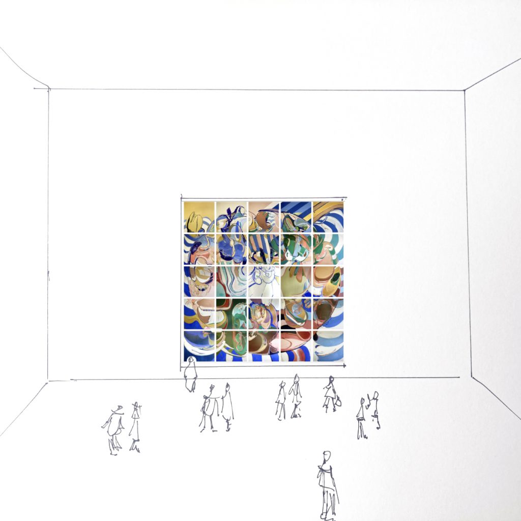 TOPIA ist ein radikal fragmentarisches, abstraktes Bildgefüge. Das Werk entstand von August 2024 bis Februar 2026 Schritt für Schritt aus 25 Modulen, die jeweils als autonome Fragmente funktionieren und erst im Zusammenspiel ihr volles Potenzial entfalten. Der Prozess des Neuordnens, Kalibrierens und Offenhaltens steht im Zentrum – das Fragmentarische wird zum Prinzip.